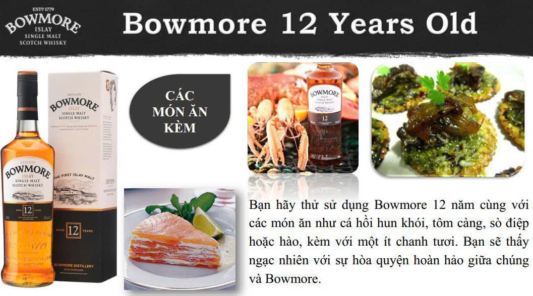 Cách thưởng thức : Dùng nguyên chất , ướp lạnh trước khi uống , Bạn có thể thưởng thức rượu Bowmore 12 cùng các món ăn như Cá hồi hun khói , Tôm càng , Sò điệp , hoặc kèm với một lát Chanh tươi . Bạn sẽ cảm thây ngạc nhiên với sự hòa quyện hoàn hảo giữa chúng với Bowmore 12 năm