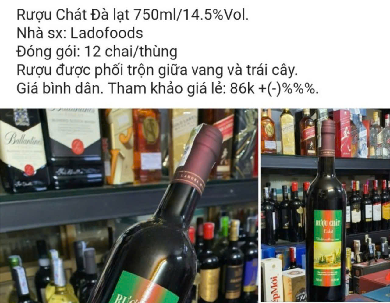 Rượu Chát Đà Lạt của Công ty CP thực phẩm Lâm Đồng ( Ladofoods ) , là sản phẩm được phối trộn giữa rượu vang Đà Lạt và Dịch trái cây . Rượu Chát Đà Lạt có mầu đỏ Rubi sâu đậm , hương thơm tinh tế của Trái cây . Vị chát cân bằng cùng vị chua rỗ nét