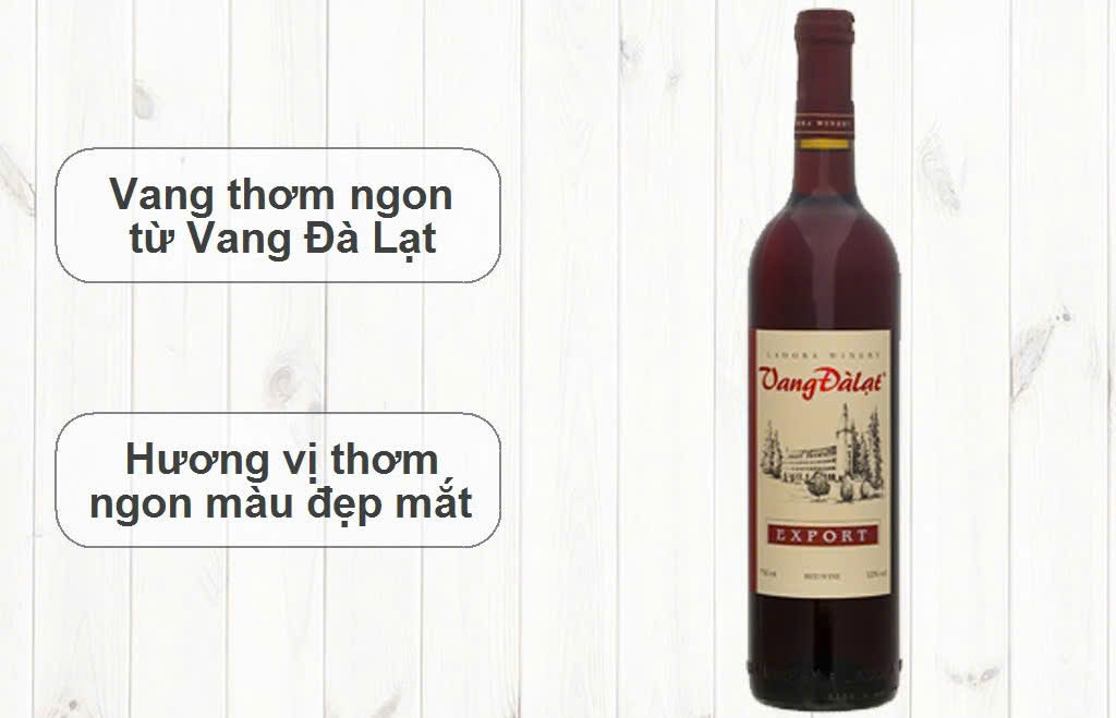 Vang Đà Lạt Export của Công ty CP thực phẩm Lâm Đồng ( LADOFOODS ) là loại vang đạt chất lượng Quốc tế , được xuất khẩu sang một số Quốc gia Châu á , khu vực Asian và đặc biệt Nhật bản là thị trường có những tiêu chuẩn rất khắt khe về Vệ sinh an toàn thực phẩm . Vang Đà Lạt Export có 2 loại là Vang Đà Lạt Export Red Wine và Vang Đà Lạt Export White Wine