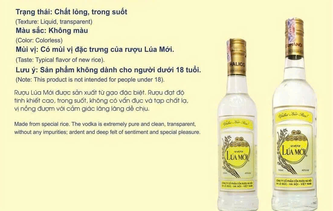 Rượu Lúa Mới là sản phẩm truyền thống của Công ty CP Cồn & Rượu Hà Nội ( HALICO ) , được sản xuất trên dây chuyền tiên tiến hiện đại nhập khẩu 100 % từ các nước có nền công nghệ chưng cất rượu nổi tiếng Thế giới . Điểm nổi bật của Rượu Nếp Mới là khi uống không có cảm giác bị đau đầu do đã được loại bỏ hết các độc tố có hại cho sức khoẻ con người là Aldehitde và Methanol vốn thường có với hàm lượng rất cao ở trong rượu dân gian